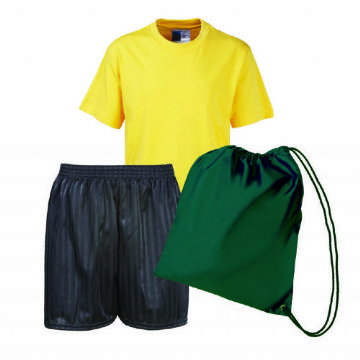 PE Kit comprises of Embroidered T-Shirt, 1 pair Shadow Stripe Shorts and an Embroidered Nylon Bag