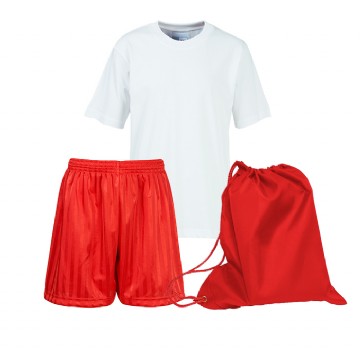 P.E. kit comprises white embroidered T shirt, red shadow stripe shorts and red embroidered P.E. bag.