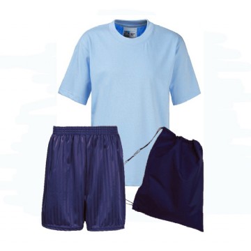 PE Kit comprises of Embroidered T-Shirt, 1 pair Shadow Stripe Shorts and an Embroidered Nylon Bag