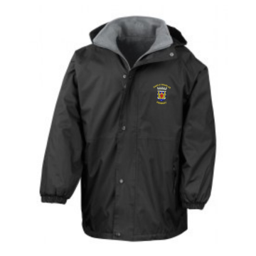 A jacket for all seasons. This coat has a built-in studded storm flap and waterproof foldaway hood, waterproof polyester with taped seams one side, with a cosy fleece reverse, offering all-round weather protection to keep your pupils warm and dry on their journey to and from school.