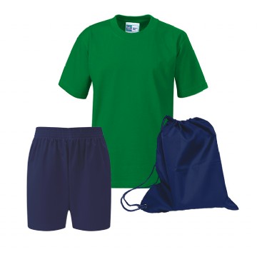 PE Kit comprises of Embroidered T-Shirt, 1 pair Poly Cotton Shorts and an Embroidered PE Bag