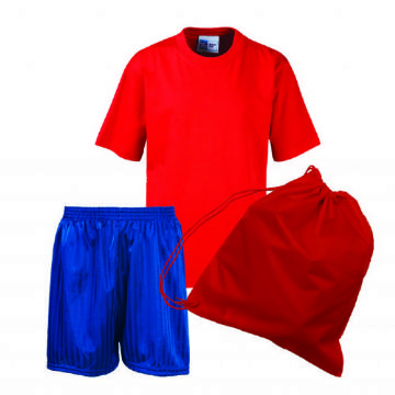 PE Kit comprises of Embroidered T-Shirt, 1 pair Shadow Stripe Shorts and an Embroidered Nylon Bag