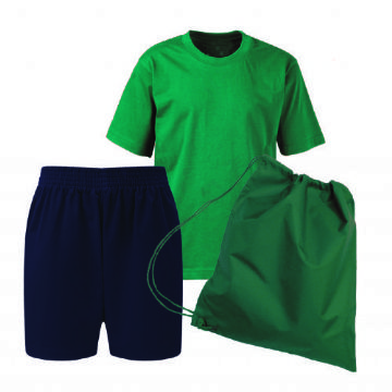 PE Kit comprises of Embroidered T-Shirt, 1 pair Poly Cotton Shorts and an Embroidered Nylon Bag