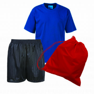 PE Kit comprises of Embroidered T-Shirt, 1 pair Shadow Stripe Shorts and an Embroidered Nylon Bag