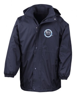 A jacket for all seasons. This coat has a built-in studded storm flap and waterproof foldaway hood, waterproof polyester with taped seams one side, with a cosy fleece reverse, offering all-round weather protection to keep your pupils warm and dry on their journey to and from school.