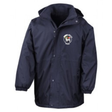 A jacket for all seasons. This coat has a built-in studded storm flap and waterproof foldaway hood, waterproof polyester with taped seams one side, with a cosy fleece reverse, offering all-round weather protection to keep your pupils warm and dry on their journey to and from school.
