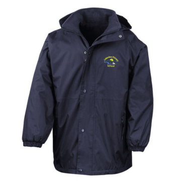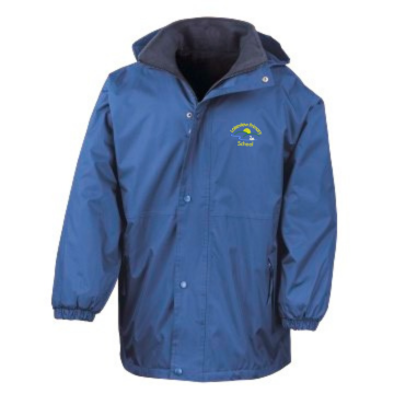 A jacket for all seasons. This coat has a built-in studded storm flap and waterproof foldaway hood, waterproof polyester with taped seams one side, with a cosy fleece reverse, offering all-round weather protection to keep your pupils warm and dry on their journey to and from school.