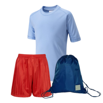 PE Kit comprises of Embroidered T-Shirt, 1 pair Shadow Stripe Shorts and an Embroidered Nylon Bag
