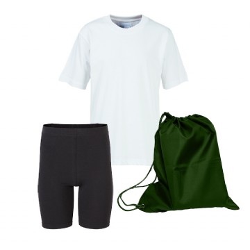 PE kit bundle includes one embroidered t-shirt, one embroidered nylon pe bag and a par of fitted shorts.