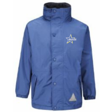 A jacket for all seasons. This coat has a built-in studded storm flap and waterproof foldaway hood, waterproof polyester with taped seams one side, with a cosy fleece reverse, offering all-round weather protection to keep your pupils warm and dry on their journey to and from school.