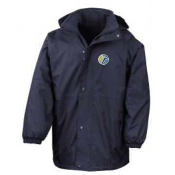 A jacket for all seasons. This coat has a built-in studded storm flap and waterproof foldaway hood, waterproof polyester with taped seams one side, with a cosy fleece reverse, offering all-round weather protection to keep your pupils warm and dry on their journey to and from school.