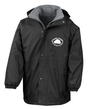 A jacket for all seasons. This coat has a built-in studded storm flap and waterproof foldaway hood, waterproof polyester with taped seams one side, with a cosy fleece reverse, offering all-round weather protection to keep your pupils warm and dry on their journey to and from school.