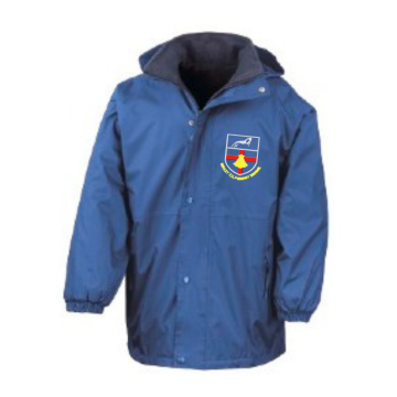 A jacket for all seasons. This coat has a built-in studded storm flap and waterproof foldaway hood, waterproof polyester with taped seams one side, with a cosy fleece reverse, offering all-round weather protection to keep your pupils warm and dry on their journey to and from school.