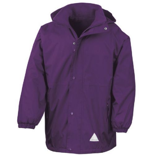 A jacket for all seasons. This coat has a built-in studded storm flap and waterproof foldaway hood, waterproof polyester with taped seams one side, with a cosy fleece reverse, offering all-round weather protection to keep your pupils warm and dry on their journey to and from school.