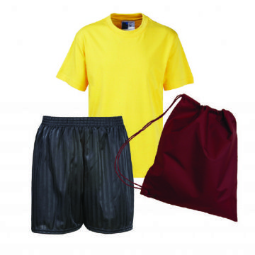 PE Kit comprises of Embroidered T-Shirt, 1 pair Shadow Stripe Shorts and an Embroidered Nylon Bag