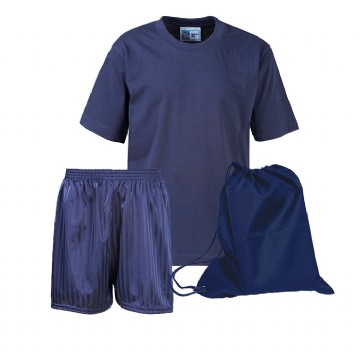 PE Kit comprises of Embroidered T-Shirt, 1 pair Shadow Stripe Shorts and an Embroidered Nylon Bag