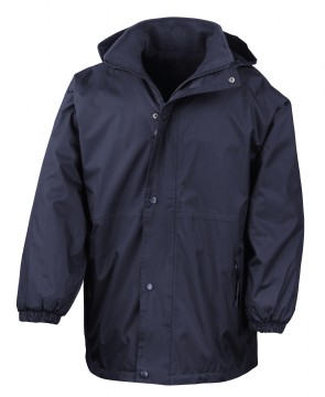 A jacket for all seasons. This coat has a built-in studded storm flap and waterproof foldaway hood, waterproof polyester with taped seams one side, with a cosy fleece reverse, offering all-round weather protection to keep your pupils warm and dry on their journey to and from school.