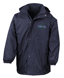 A jacket for all seasons. This coat has a built-in studded storm flap and waterproof foldaway hood, waterproof polyester with taped seams one side, with a cosy fleece reverse, offering all-round weather protection to keep your pupils warm and dry on their journey to and from school.