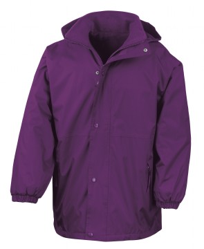 A jacket for all seasons. This coat has a built-in studded storm flap and waterproof foldaway hood, waterproof polyester with taped seams one side, with a cosy fleece reverse, offering all-round weather protection to keep your pupils warm and dry on their journey to and from school.