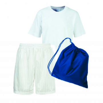 PE Kit comprises of Embroidered T-Shirt, 1 pair Shadow Stripe Shorts and an Embroidered Nylon Bag