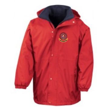 A jacket for all seasons. This coat has a built-in studded storm flap and waterproof foldaway hood, waterproof polyester with taped seams one side, with a cosy fleece reverse, offering all-round weather protection to keep your pupils warm and dry on their journey to and from school.