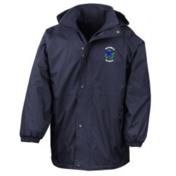 A jacket for all seasons. This coat has a built-in studded storm flap and waterproof foldaway hood, waterproof polyester with taped seams one side, with a cosy fleece reverse, offering all-round weather protection to keep your pupils warm and dry on their journey to and from school.
