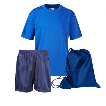 PE Kit comprises of Embroidered T-Shirt, 1 pair Shadow Stripe Shorts and an Embroidered Nylon Bag