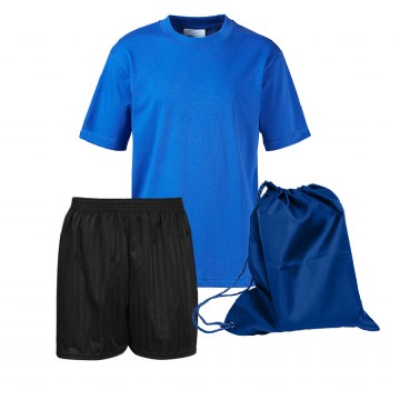 PE Kit comprises of Embroidered T-Shirt, 1 pair Shadow Stripe Shorts and an Embroidered Nylon Bag