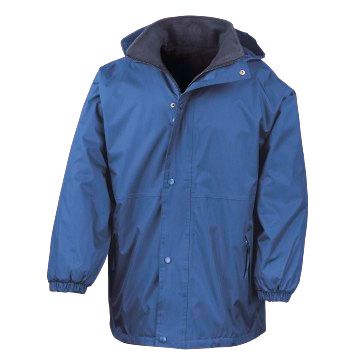 A jacket for all seasons. This coat has a built-in studded storm flap and waterproof foldaway hood, waterproof polyester with taped seams one side, with a cosy fleece reverse, offering all-round weather protection to keep your pupils warm and dry on their journey to and from school.