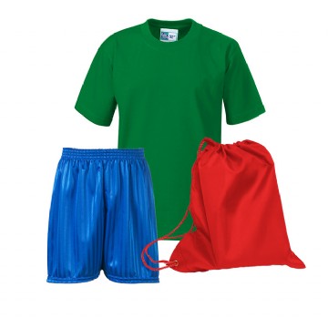 PE Kit comprises of Embroidered T-Shirt, 1 pair Shadow Stripe Shorts and an Embroidered Nylon Bag