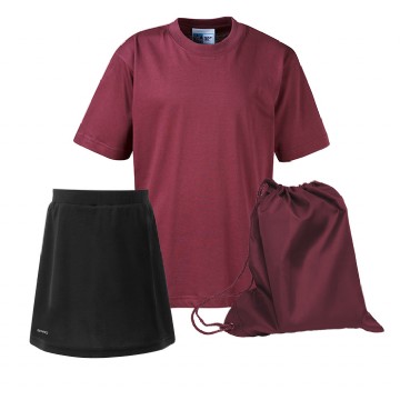 PE Kit with Skort comprises of an Embroidered T-Shirt, Plain Skort and an Embroidered Nylon Bag