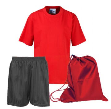 The PE Kit comprises of an embroidered tee shirt, a pair of shadow stripe shorts and an embroidered PE bag