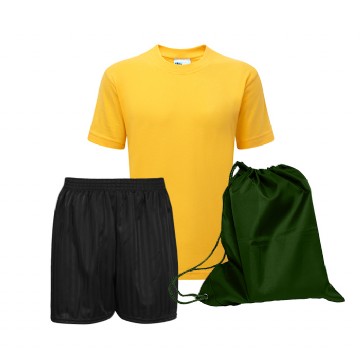 PE Kit comprises of Embroidered T-Shirt, 1 pair Shadow Stripe Shorts and an Embroidered PE Bag