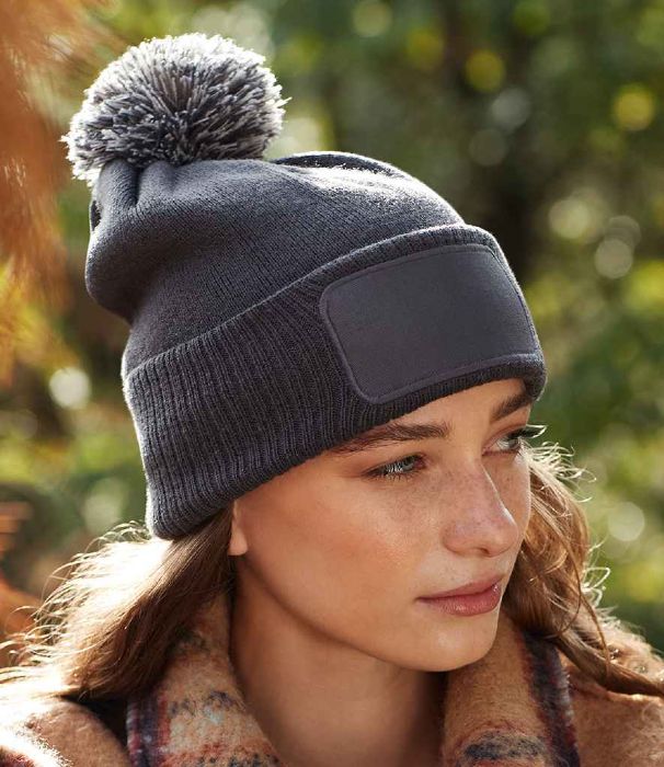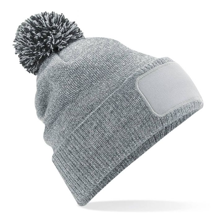 •Double layer knit. •Ribbed cuff. •Two tone pom pom. •Cotton twill patch for printing (10 x 5cm). •Tear out label.